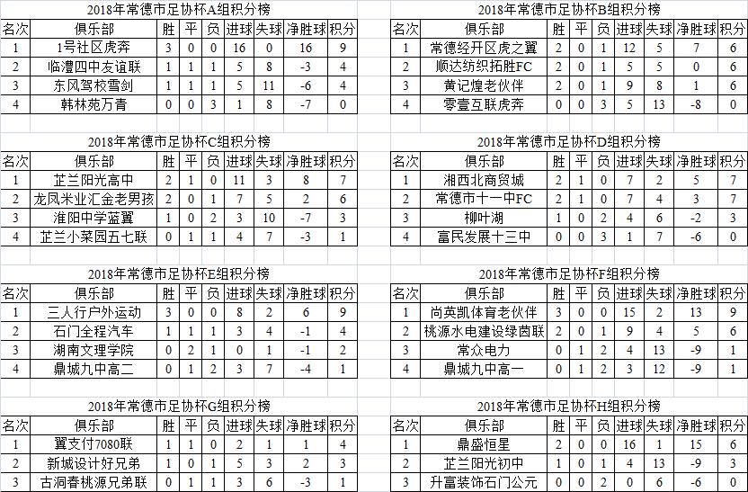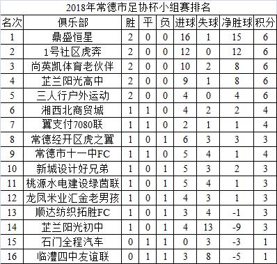 2018年常德市足协杯积分榜